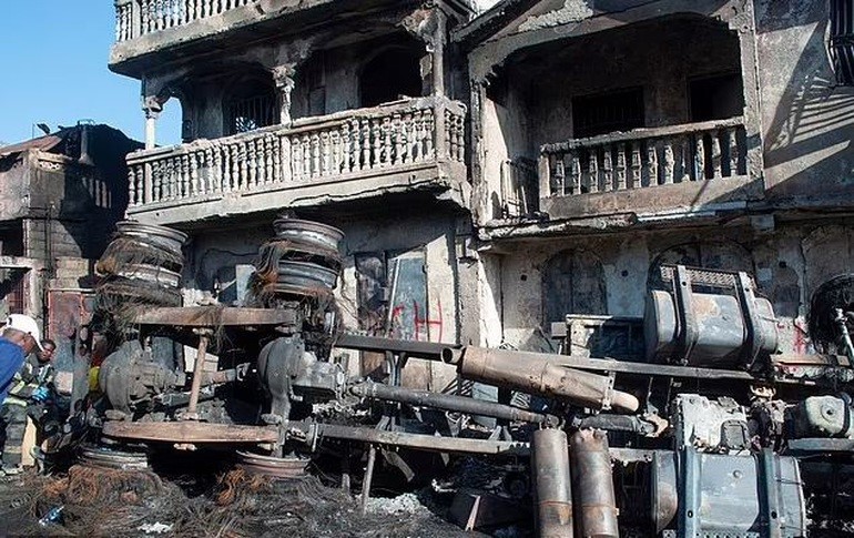 Các bức ảnh được công bố cho thấy những phần còn sót lại của xe bồn bị cháy, trong khi các ngôi nhà xung quanh cũng bị cháy và hư hại sau vụ nổ.
